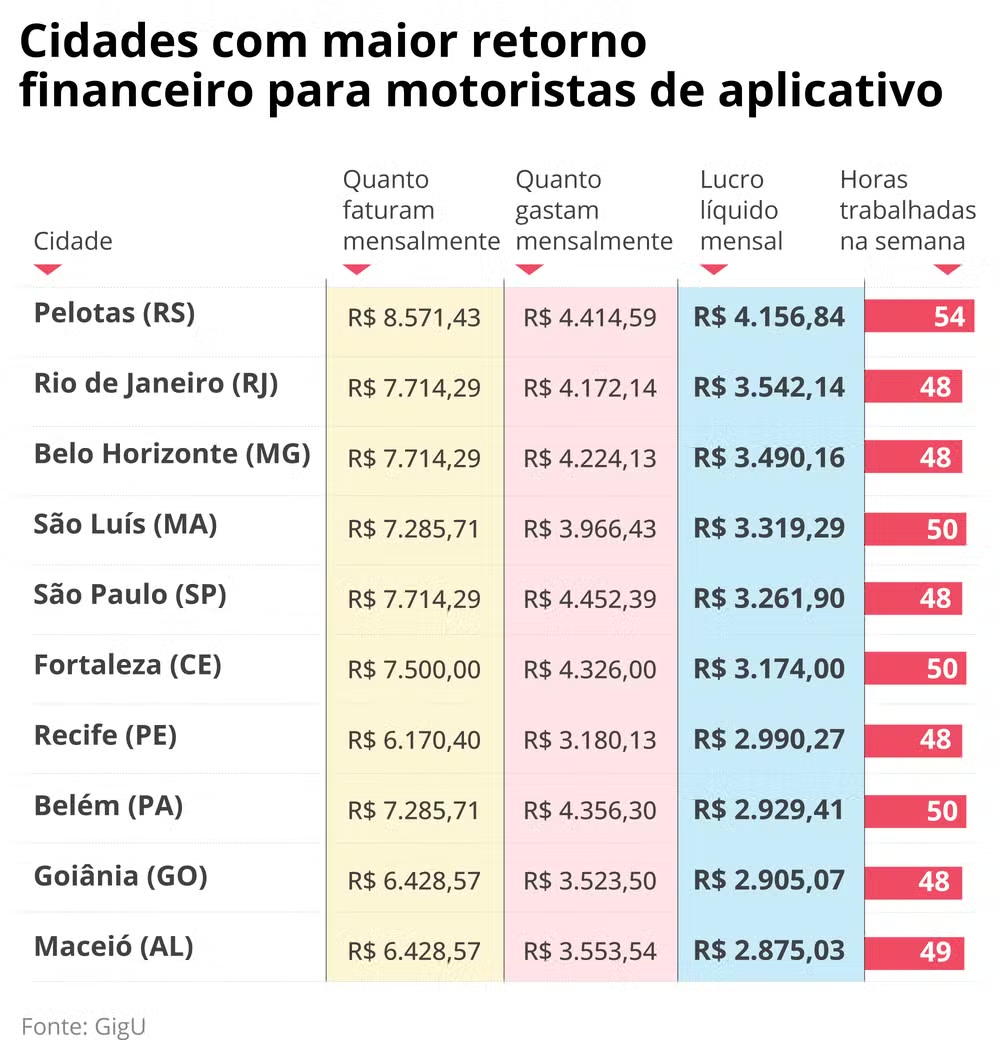 A pesquisa considerou as cidades com maior número de usuários da função “cálculo de custo”, que mostra quanto o motorista efetivamente gasta para rodar — e, por consequência, quanto está ganhando. Dos mais de 210 mil usuários do aplicativo, 93 mil preencheram os dados de novembro de 2023 até maio deste ano.
