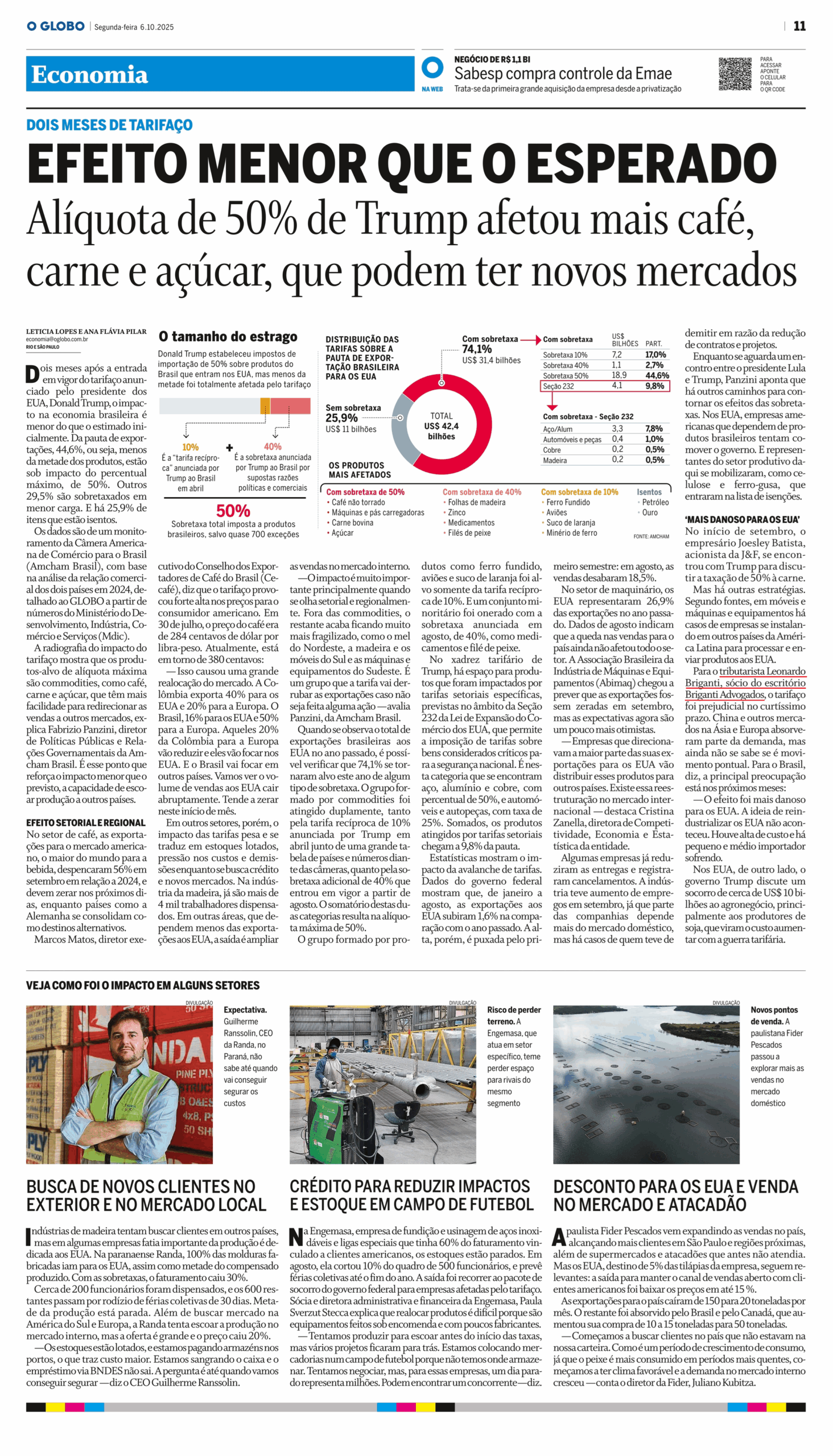 A radiografia do impacto do tarifaço mostra que os produtos-alvo de alíquota máxima são commodities, como café, carne e açúcar, que têm mais facilidade para redirecionar as vendas a outros mercados, explica Fabrizio Panzini, diretor de Políticas Públicas e Relações Governamentais da Amcham Brasil. É esse ponto que reforça o impacto menor que o previsto, a capacidade de escoar produção a outros países.
