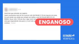 ESTADÃO 10/01/2025 Movimentação acima de R$ 5 mil no Pix não implica necessariamente em IR de 27,5%, dizem advogados Nova norma da Receita Federal aumenta fiscalização, mas só resulta em multa se valores forem incompatíveis com a renda declarada;...