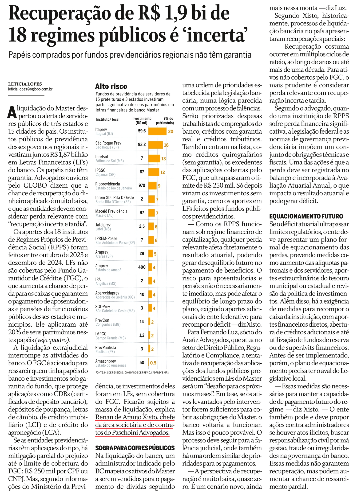 — Como os RPPS funcionam sob regime financeiro de capitalização, qualquer perda relevante afeta diretamente o resultado atuarial, podendo gerar desequilíbrio futuro no pagamento de benefícios. O risco para aposentadorias e pensões não é necessariamente imediato, mas pode afetar o equilíbrio de longo prazo do plano, exigindo aportes adicionais do ente federativo para recompor o déficit — diz Xisto.