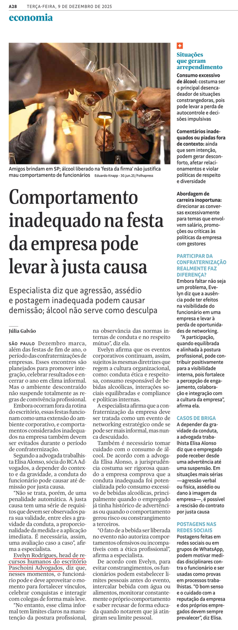 Também é necessário tomar cuidado com o consumo de álcool. De acordo com a advogada Elisa Alonso, a jurisprudência costuma ser rigorosa quando a empresa comprova que a conduta inadequada foi potencializada pelo consumo excessivo de bebidas alcóolicas, principalmente quando o empregado já tinha histórico de advertências ou quando o comportamento gerou risco ou constrangimento a terceiros.