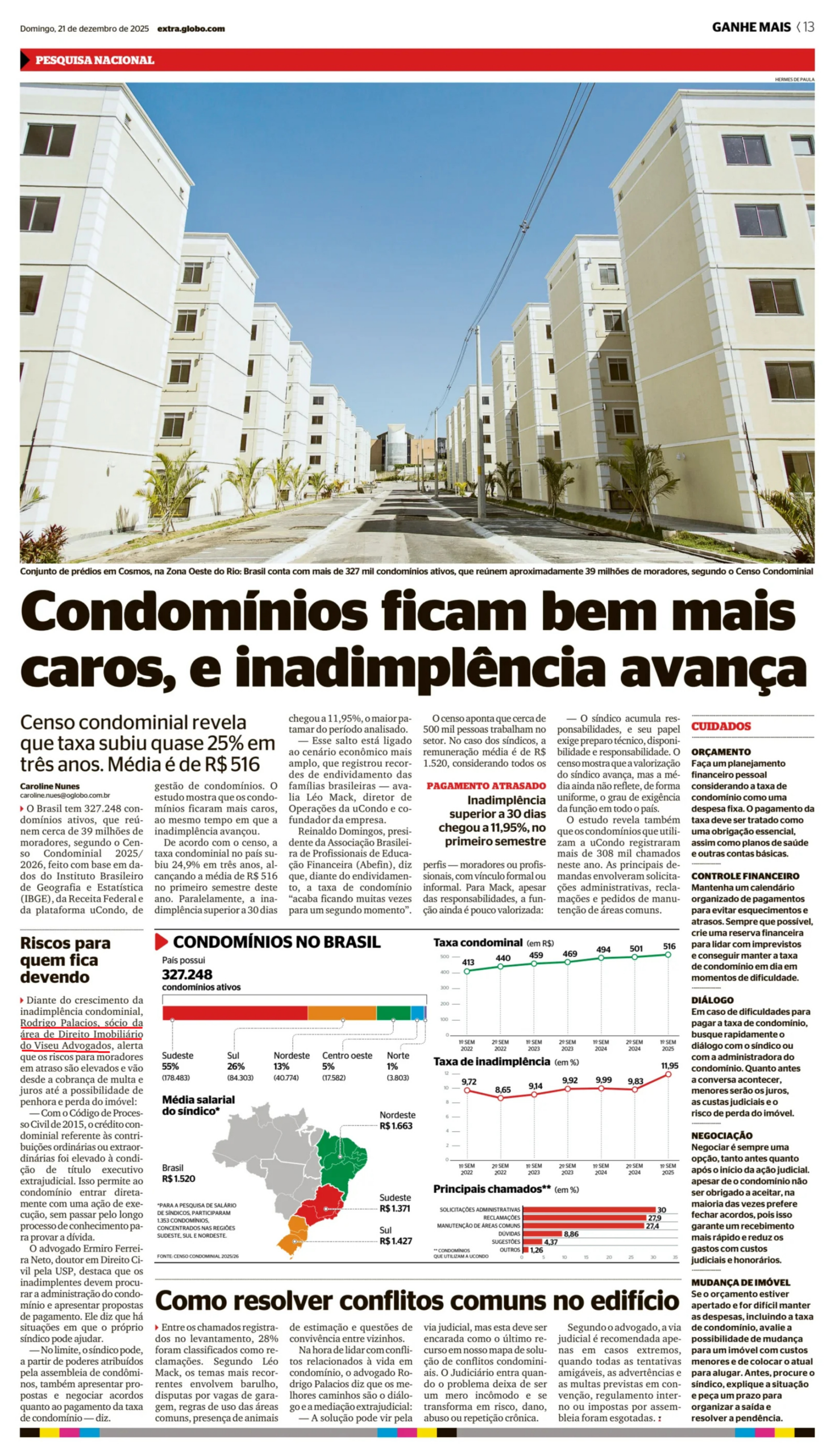 Segundo o censo, a taxa condominial no país subiu 24,9% em três anos, alcançando a média de R$ 516 no primeiro semestre deste ano. Paralelamente, a inadimplência superior a 30 dias chegou a 11,95%, o maior patamar do período analisado.