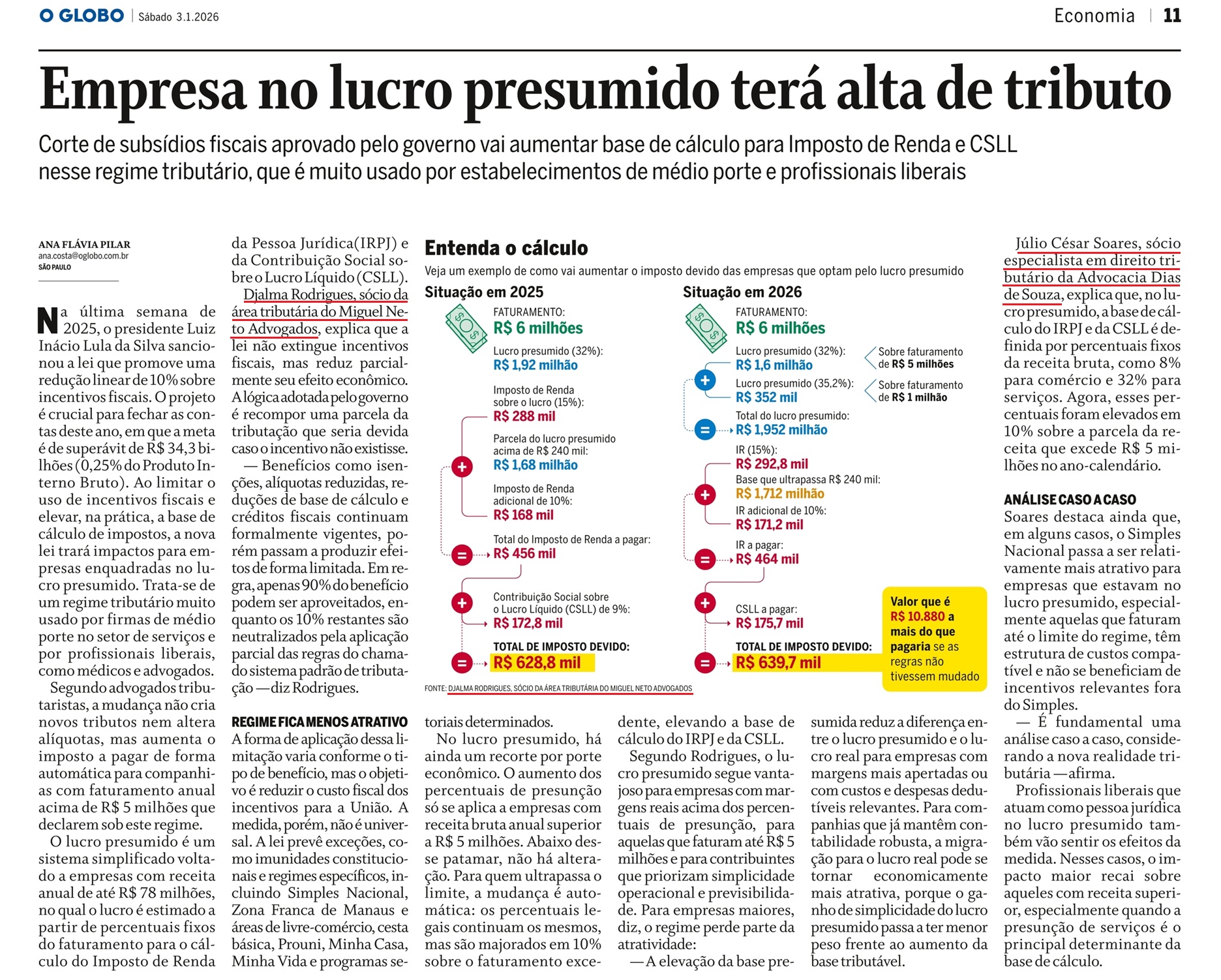 — A elevação da base presumida (sobre a qual incide o imposto) reduz a diferença entre o lucro presumido e o lucro real para empresas com margens mais apertadas ou com custos e despesas dedutíveis relevantes. Para companhias que já mantêm contabilidade robusta, a migração para o lucro real pode se tornar economicamente mais atrativa, porque o ganho de simplicidade do lucro presumido passa a ter menor peso frente ao aumento da base tributável.