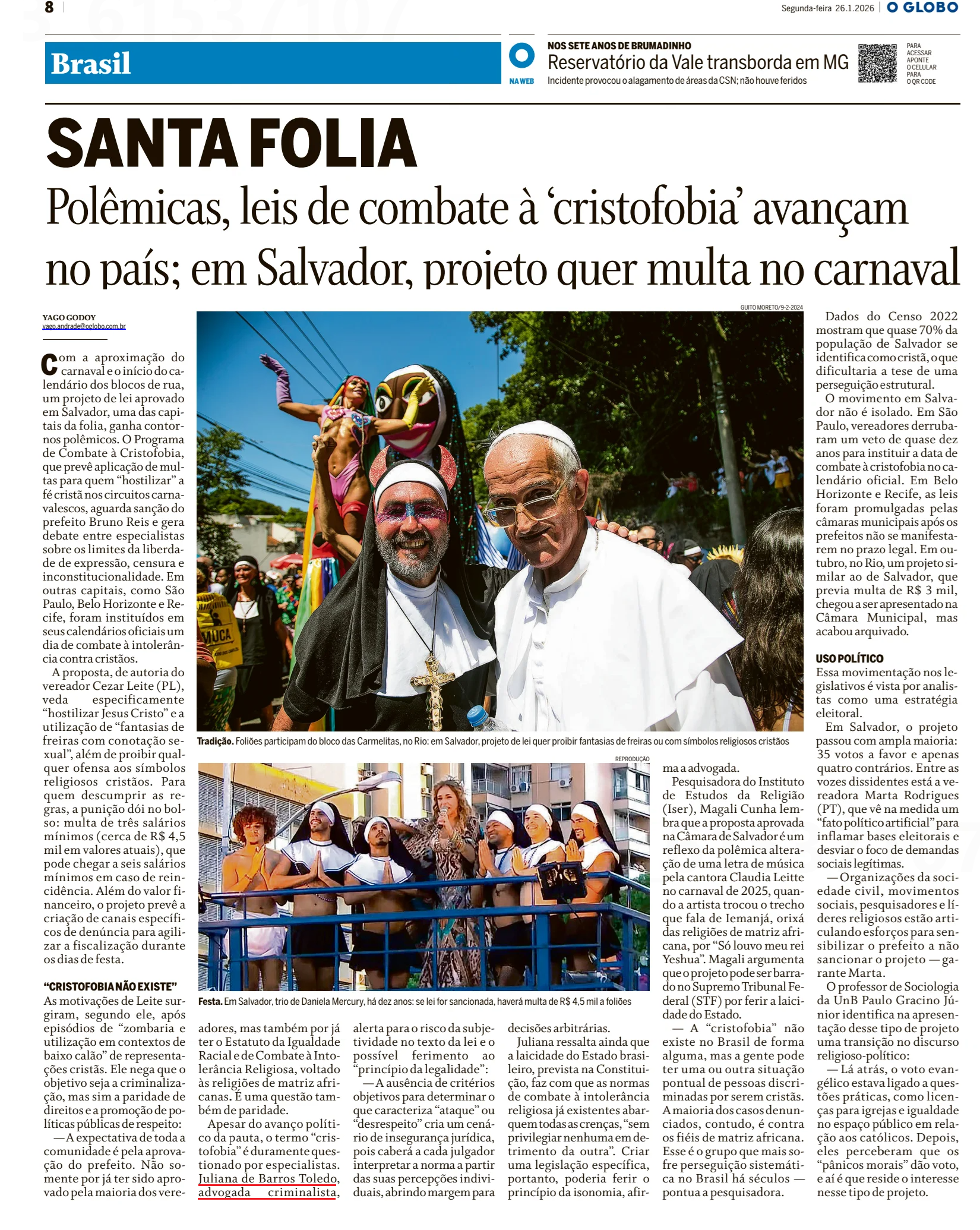 Pesquisadora do Instituto de Estudos da Religião (Iser), Magali Cunha lembra que a proposta aprovada na Câmara de Salvador é um reflexo da polêmica alteração de uma letra de música pela cantora Claudia Leitte no carnaval de 2025, quando a artista trocou o trecho que fala de Iemanjá, orixá das religiões de matriz africana, por “Só louvo meu rei Yeshua”. Magali argumenta que o projeto pode ser barrado no Supremo Tribunal Federal (STF) por ferir a laicidade do Estado.