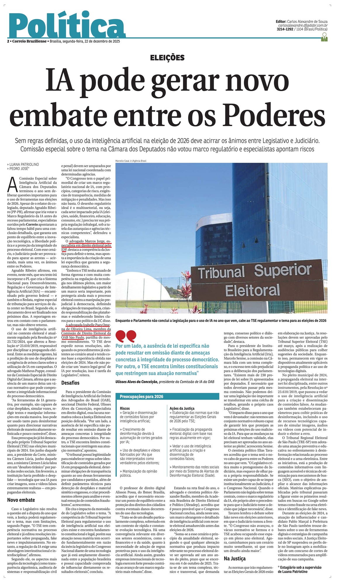 A Comissão Especial sobre Inteligência Artificial da Câmara dos Deputados terminou o ano sem deliberar questões importantes para o uso de ferramentas nas eleições de 2026. Apesar de o relator do colegiado, deputado Agnaldo Ribeiro (PP-PB), afirmar que iria votar o Marco Regulatório da IA antes do recesso parlamentar, especialistas ouvidos pelo Correio apontaram a faltou tempo hábil para uma conclusão detalhada, que garanta um ponto de equilíbrio entre a inovação tecnológica, a liberdade política e a proteção da integridade do processo eleitoral. Com esse cenário, o Judiciário pode ser provocado para aparar as arestas — acirrando, mais uma vez, os ânimos entre os Poderes.