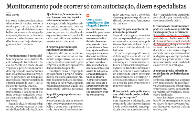 Bruno Minoru Okajima, sócio especialista em direito do trabalho do Autuori Burmann Sociedade de Advogados, diz que o monitoramento pode embasar medidas disciplinares, inclusive a dispensa, desde que respeitados os limites legais e que o empregado tenha ciência prévia sobre a ferramenta utilizada, a sua finalidade e os critérios de avaliação.