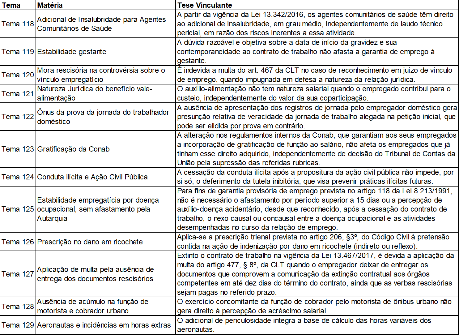 O quadro abaixo apresenta um resumo das 12 teses vinculantes fixadas pelo TST, das quais destacamos o Tema 119, que trata da empregada gestante, Tema 124, sobre Ação Civil Pública, e o Tema 125, a respeito de estabilidade no emprego: