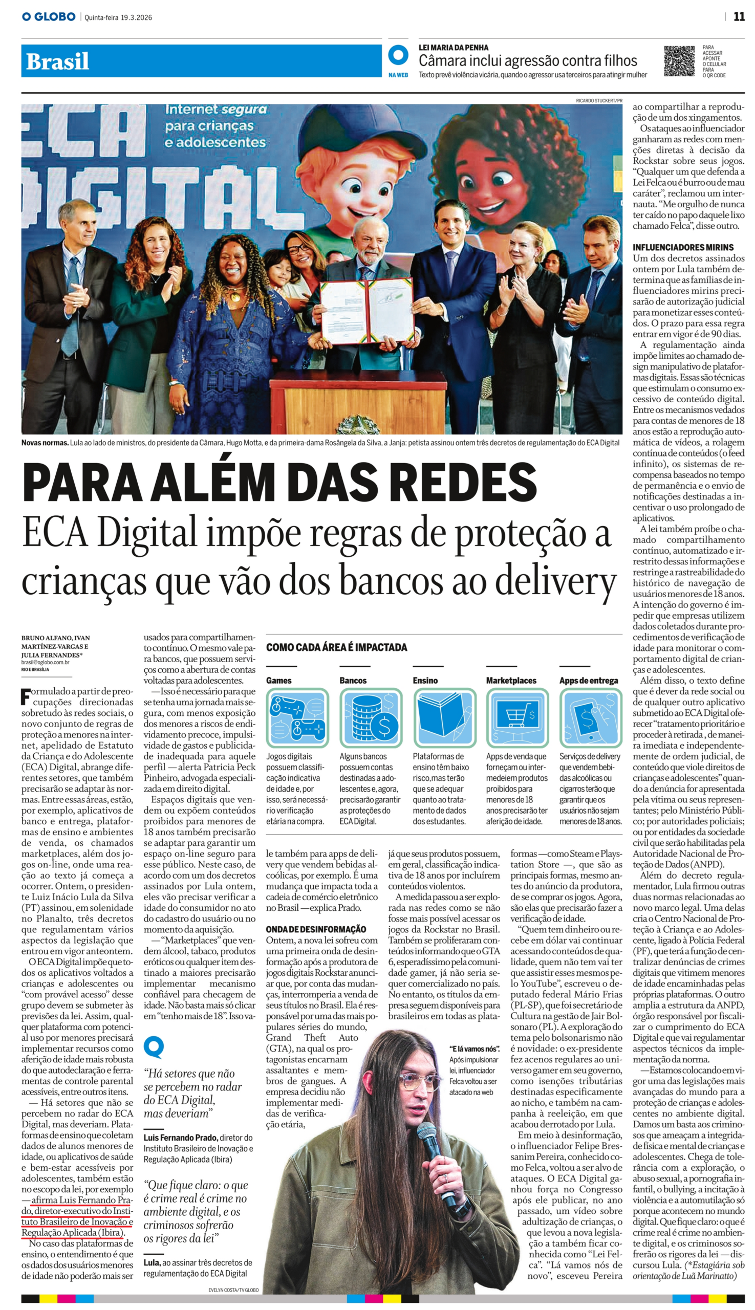 — Estamos colocando em vigor uma das legislações mais avançadas do mundo para a proteção de crianças e adolescentes no ambiente digital. Damos um basta aos criminosos que ameaçam a integridade física e mental de crianças e adolescentes. Chega de tolerância com a exploração, o abuso sexual, a pornografia infantil, o bullying, a incitação à violência e a automutilação só porque acontecem no mundo digital. Que fique claro: o que é crime real é crime no ambiente digital, e os criminosos sofrerão os rigores da lei — discursou Lula.