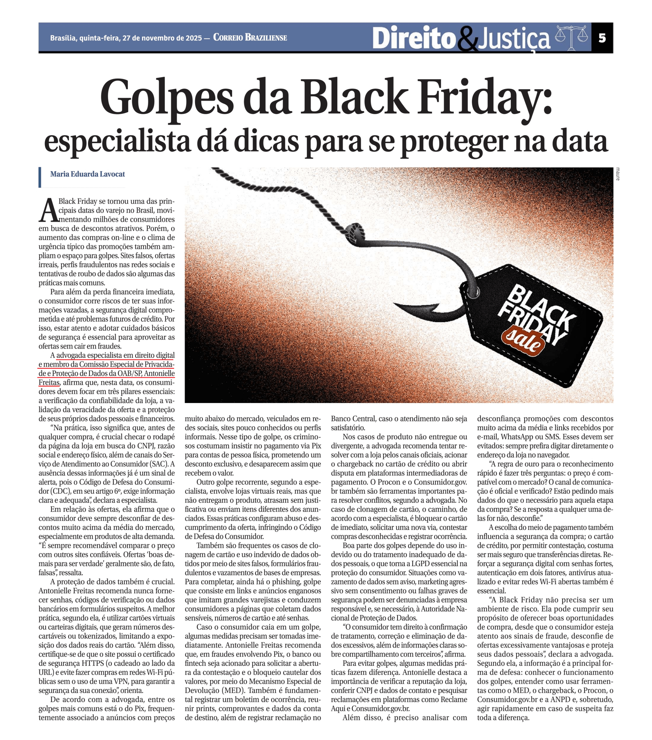 A advogada especialista em direito digital e membro da Comissão Especial de Privacidade e Proteção de Dados da OAB/SP, Antonielle Freitas, afirma que, nesta data, os consumidores devem focar em três pilares essenciais: a verificação da confiabilidade da loja, a validação da veracidade da oferta e a proteção de seus próprios dados pessoais e financeiros.