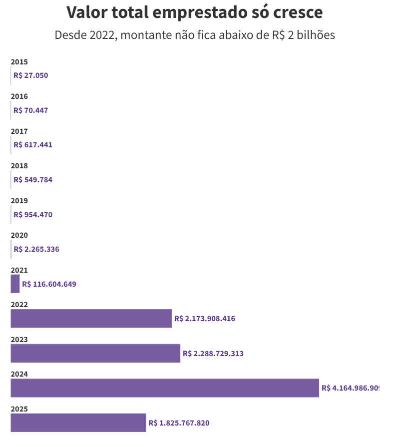 Com base na Instrução Normativa 136 e nesses três tipos de produtos financeiros, o valor emprestado por instituições financeiras a crianças saltou de R$ 116 milhões em 2021 para R$ 4,1 bilhões em 2024.