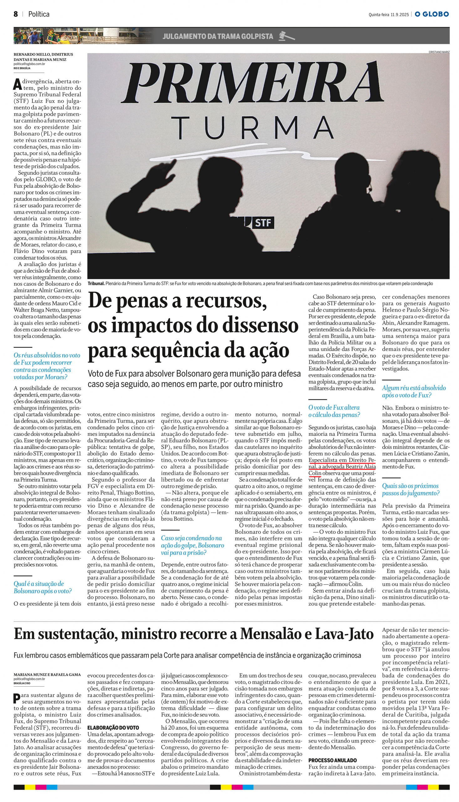 Segundo juristas consultados pelo GLOBO, o voto de Fux pela absolvição de Bolsonaro por todos os crimes imputados na denúncia só poderá ser usado para recorrer de uma eventual sentença condenatória caso outro integrante da Primeira Turma acompanhe o ministro. Até agora, os ministros Alexandre de Moraes, relator do caso, e Flávio Dino votaram para condenar todos os réus.