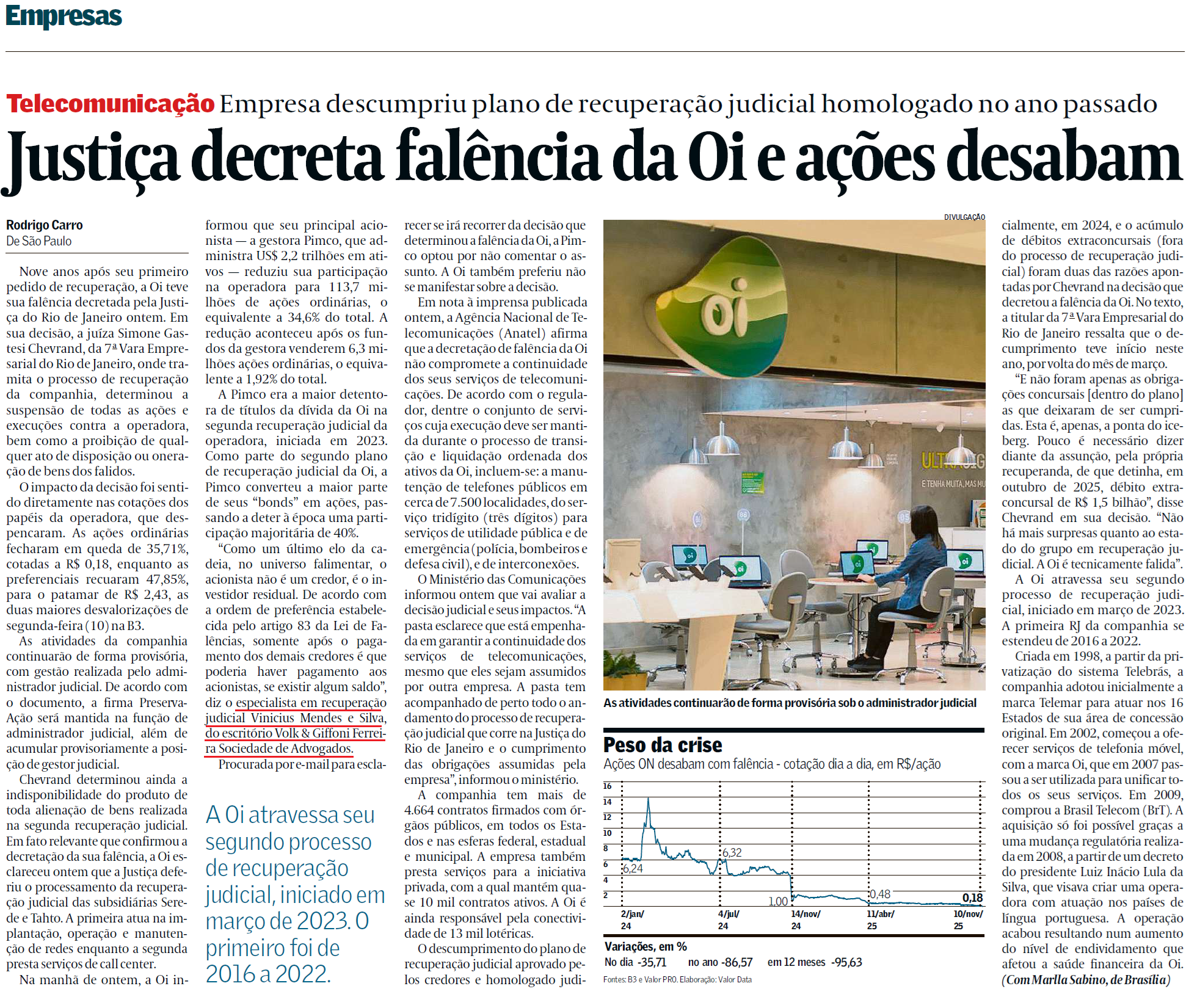 Nove anos após seu primeiro pedido de recuperação, a Oi teve sua falência decretada pela Justiça do Rio de Janeiro ontem. Em sua decisão, a juíza Simone Gastesi Chevrand, da 7ª Vara Empresarial do Rio de Janeiro, onde tramita o processo de recuperação da companhia, determinou a suspensão de todas as ações e execuções contra a operadora, bem como a proibição de qualquer ato de disposição ou oneração de bens dos falidos.