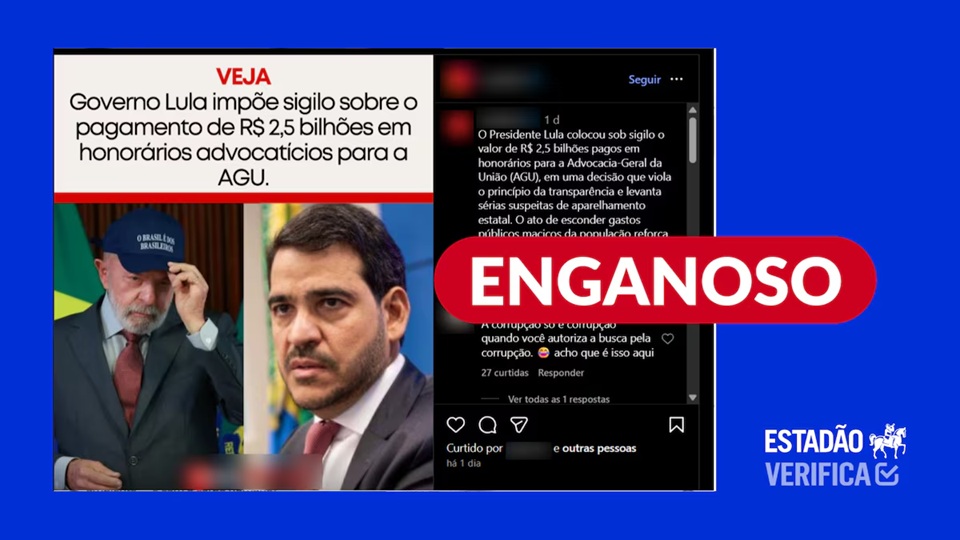 O que estão compartilhando: que o presidente Luiz Inácio Lula da Silva teria colocado sob sigilo o valor de R$ 2,5 bilhões pagos em honorários para a Advocacia-Geral da União (AGU).