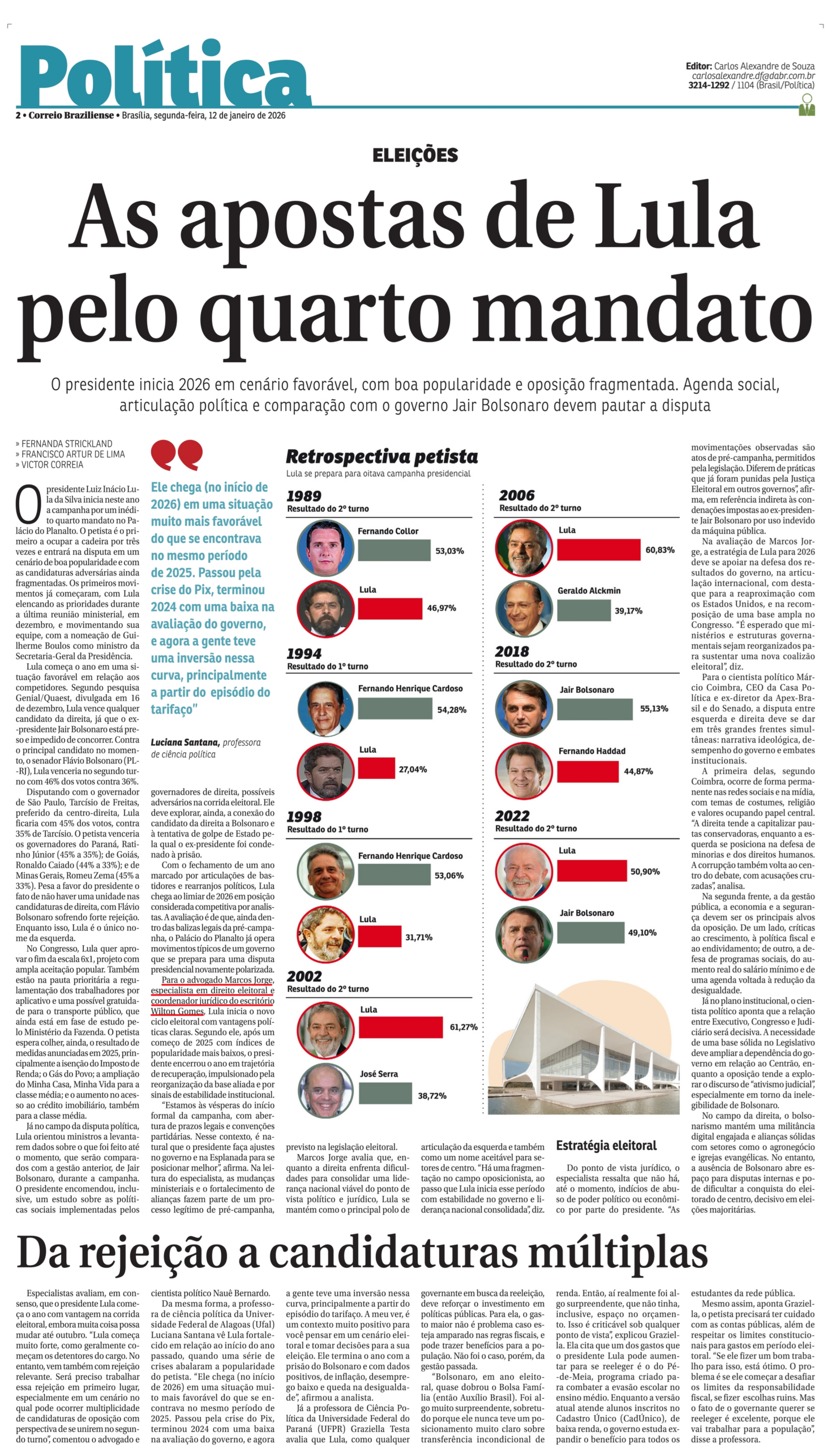 Para o advogado Marcos Jorge, especialista em direito eleitoral e coordenador jurídico do escritório Wilton Gomes, Lula inicia o novo ciclo eleitoral com vantagens políticas claras. Segundo ele, após um começo de 2025 com índices de popularidade mais baixos, o presidente encerrou o ano em trajetória de recuperação, impulsionado pela reorganização da base aliada e por sinais de estabilidade institucional.
