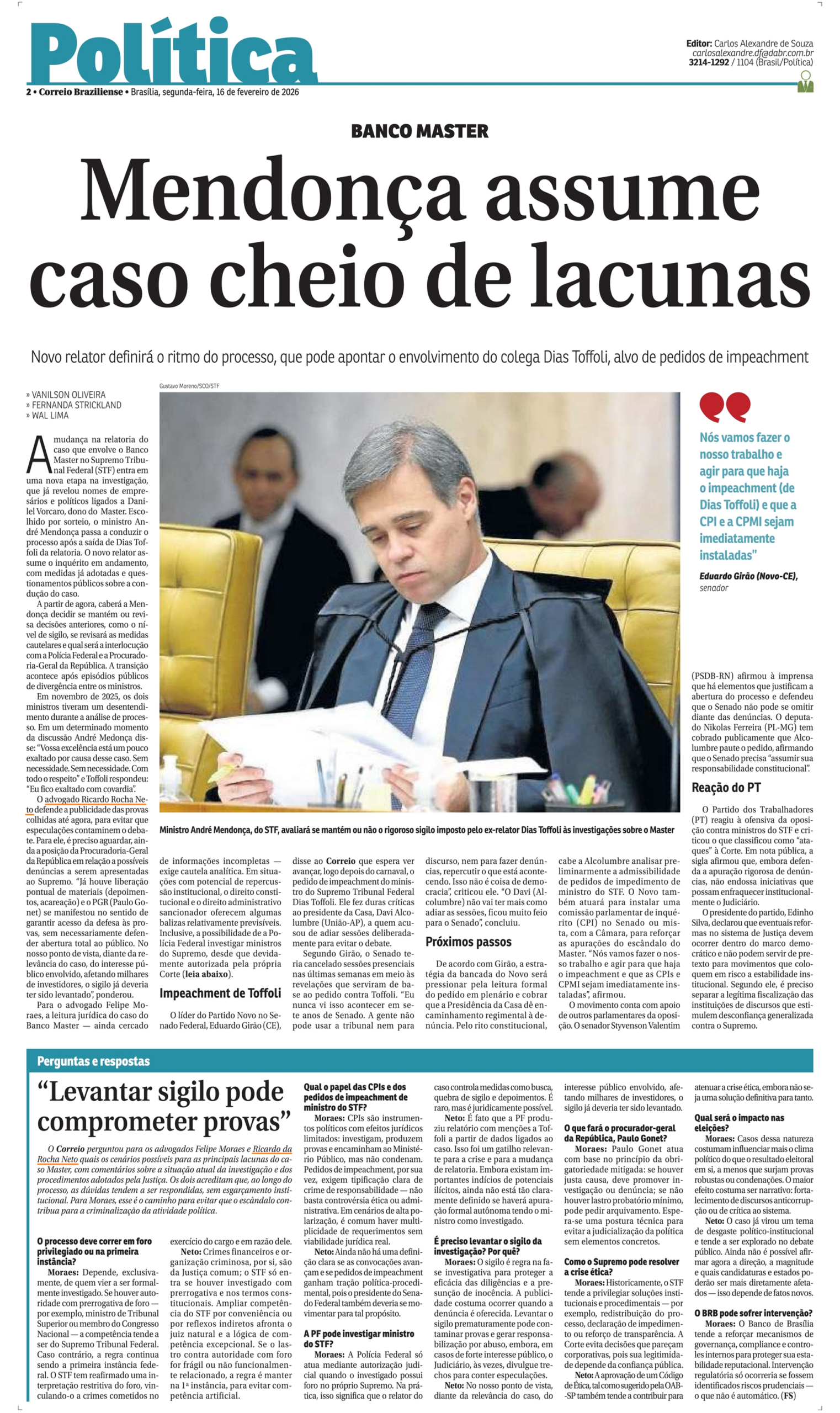 De acordo com Girão, a estratégia da bancada do Novo será pressionar pela leitura formal do pedido em plenário e cobrar que a Presidência da Casa dê encaminhamento regimental à denúncia. Pelo rito constitucional, cabe a Alcolumbre analisar preliminarmente a admissibilidade de pedidos de impedimento de ministro do STF. O Novo também atuará para instalar uma comissão parlamentar de inquérito (CPI) no Senado ou mista, com a Câmara, para reforçar as apurações do escândalo do Master. “Nós vamos fazer o nosso trabalho e agir para que haja o impeachment e que as CPIs e CPMI sejam imediatamente instaladas”, afirmou.