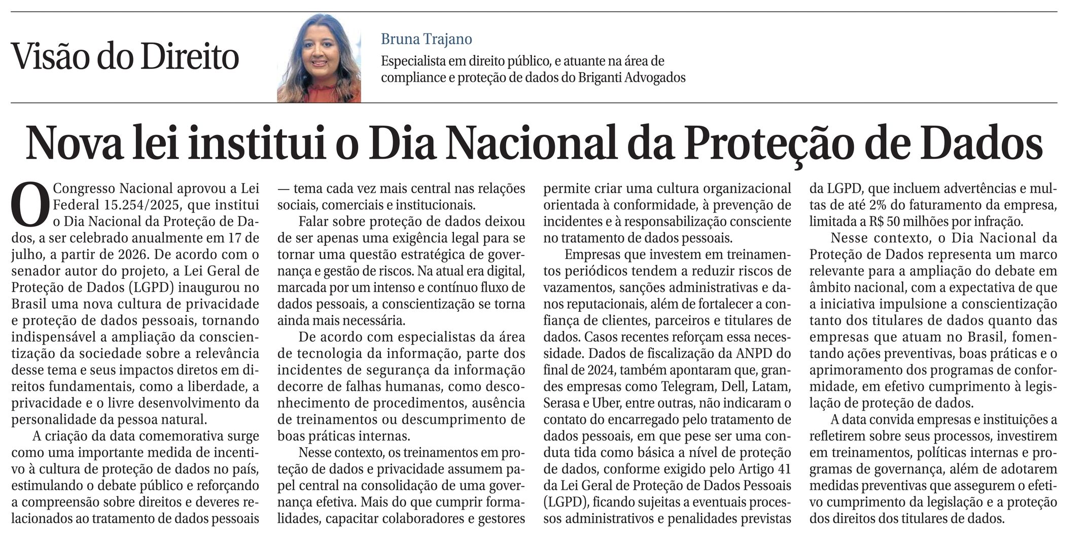 Nesse contexto, o Dia Nacional da Proteção de Dados representa um marco relevante para a ampliação do debate em âmbito nacional, com a expectativa de que a iniciativa impulsione a conscientização tanto dos titulares de dados quanto das empresas que atuam no Brasil, fomentando ações preventivas, boas práticas e o aprimoramento dos programas de conformidade, em efetivo cumprimento à legislação de proteção de dados.