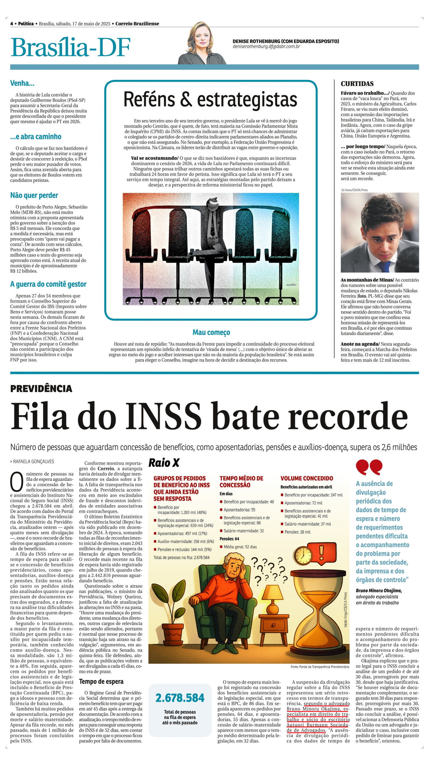O número de pessoas na fila de espera aguardando a concessão de benefícios previdenciários e assistenciais do Instituto Nacional do Seguro Social (INSS) chegou a 2.678.584 em abril. De acordo com dados do Portal da Transparência Previdenciária do Ministério da Previdência, atualizados na última sexta-feira (17/5) — após quatro meses sem divulgação —, esse é o novo recorde de brasileiros que aguardam a concessão de benefícios.