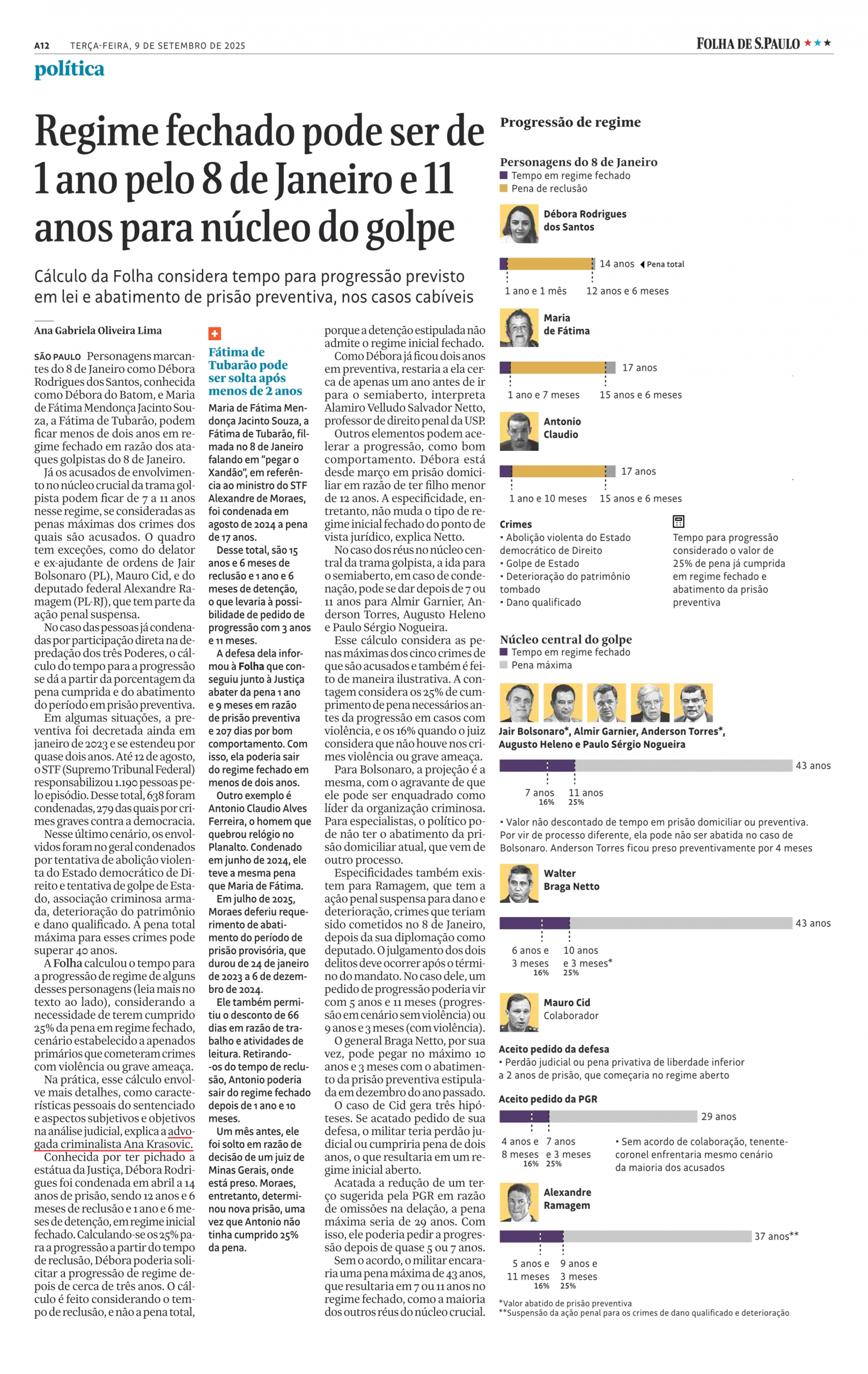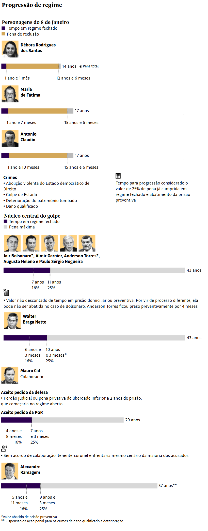 A Folha calculou o tempo para a progressão de regime de alguns desses personagens, considerando a necessidade de terem cumprido 25% da pena em regime fechado, cenário estabelecido a apenados primários que cometeram crimes com violência ou grave ameaça.