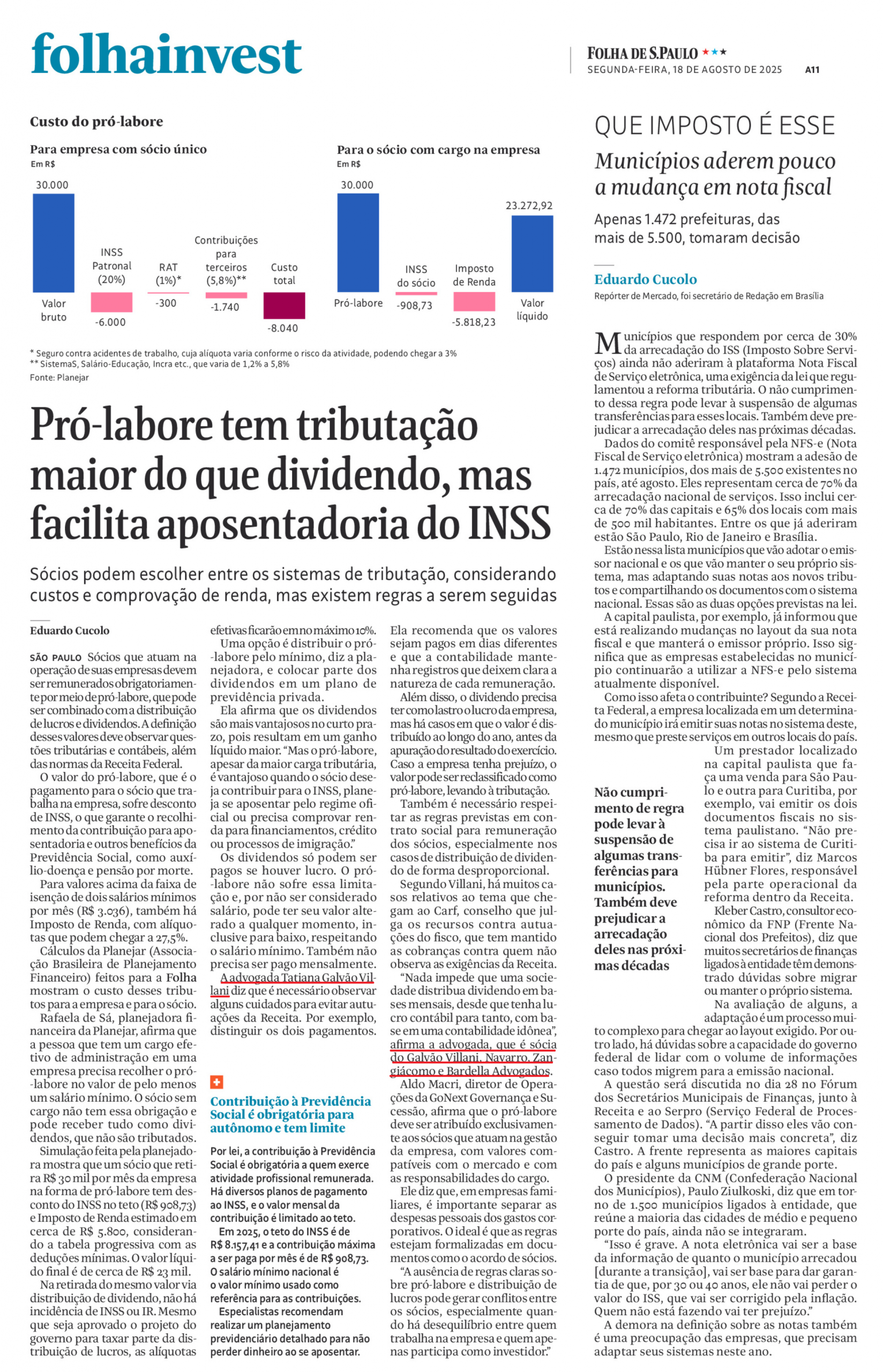 Cálculos da Planejar (Associação Brasileira de Planejamento Financeiro) feitos para a Folha mostram o custo desses tributos para a empresa e para o sócio.