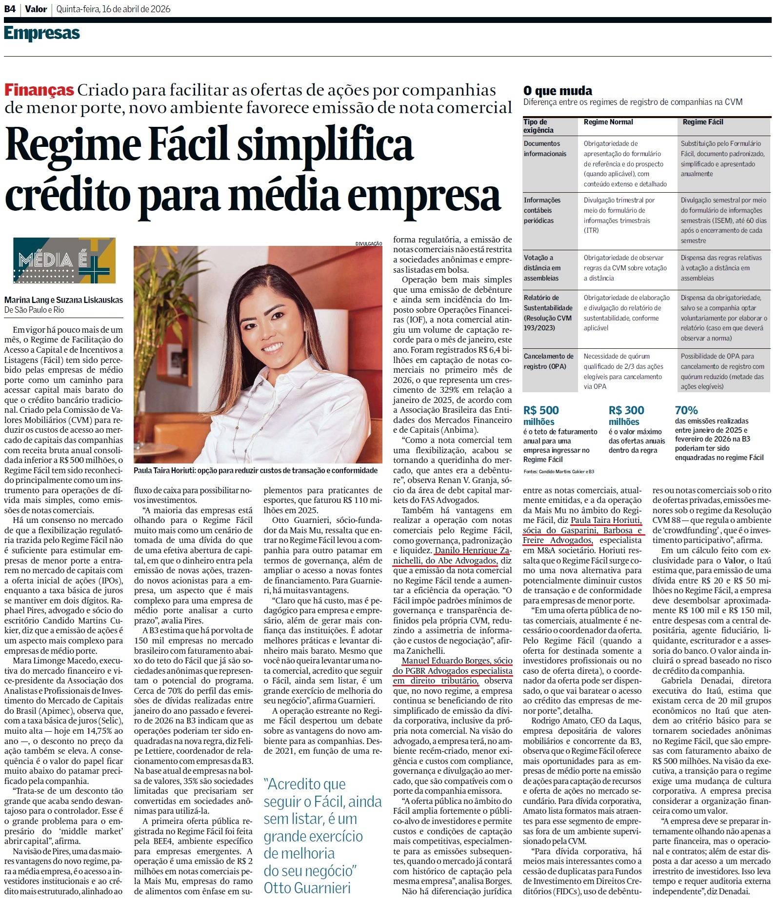 Não há diferenciação jurídica entre as notas comerciais, atualmente emitidas, e a da operação da Mais Mu no âmbito do Regime Fácil, diz Paula Taira Horiuti, sócia do Gasparini, Barbosa e Freire Advogados, especialista em M&A societário. Horiuti ressalta que o Regime Fácil surge como uma nova alternativa para potencialmente diminuir custos de transação e de conformidade para empresas de menor porte.