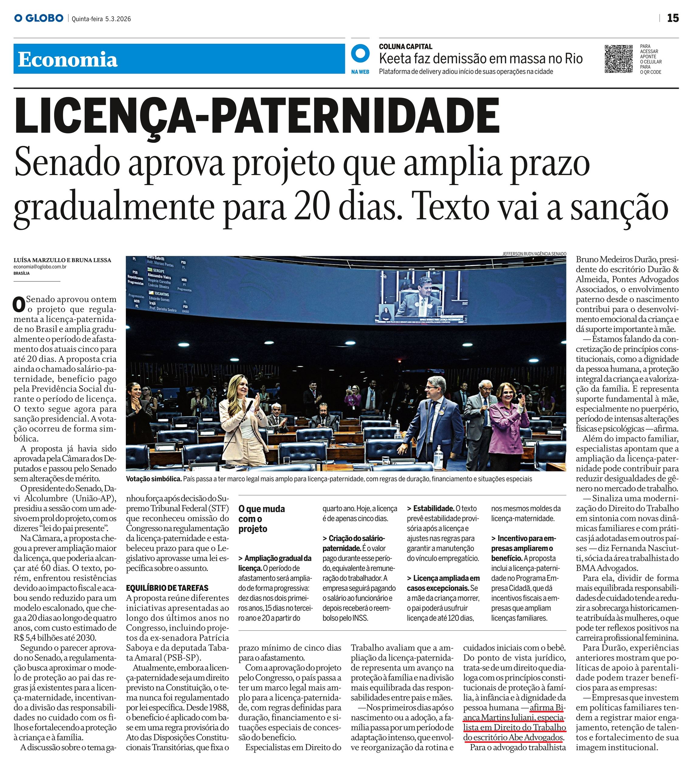 — A ampliação do prazo pode representar um marco relevante, na medida em que sinaliza uma modernização do direito do trabalho em sintonia com novas dinâmicas familiares e com práticas já adotadas em outros países que visam prestigiar o direito parental e trazer maior isonomia entre mães e pais, no contexto da relação de emprego.