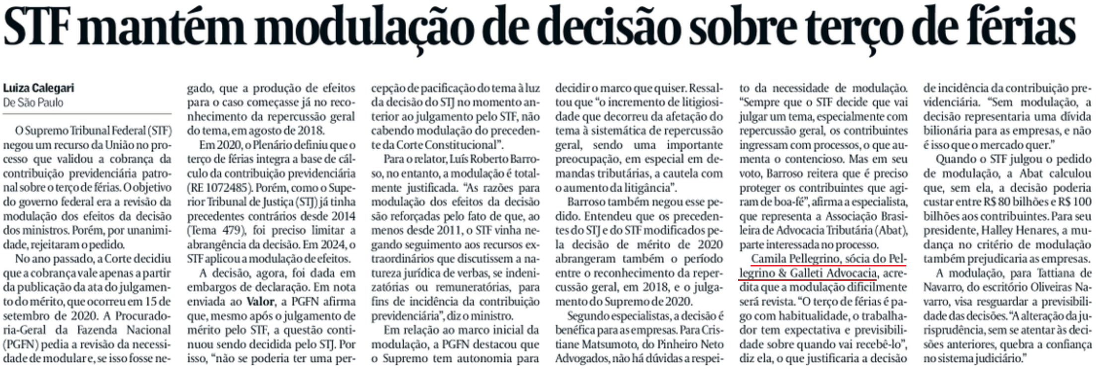 Camila Pellegrino, sócia do Pellegrino & Galleti Advocacia, acredita que a modulação dificilmente será revista. “O terço de férias é pago com habitualidade, o trabalhador tem expectativa e previsibilidade sobre quando vai recebê-lo”, diz ela, o que justificaria a decisão de incidência da contribuição previdenciária. “Sem modulação, a decisão representaria uma dívida bilionária para as empresas, e não é isso que o mercado quer.”