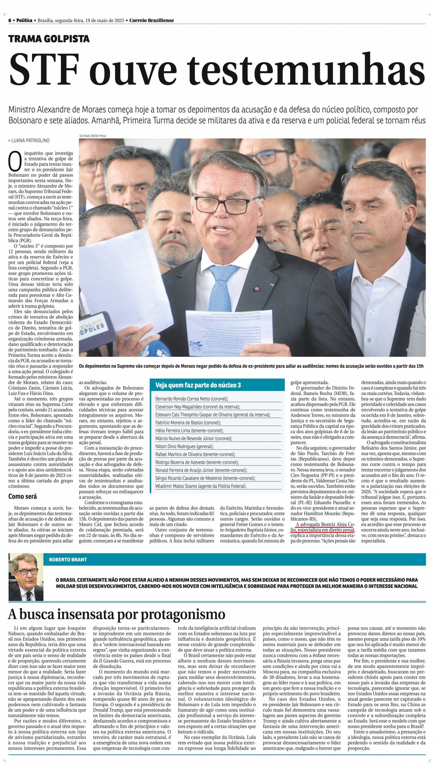 O inquérito que investiga a tentativa de golpe de Estado para tentar manter o ex-presidente Jair Bolsonaro no poder dá passos importantes nesta semana. Hoje, o ministro Alexandre de Moraes, do Supremo Tribunal Federal (STF), começa a ouvir as testemunhas convocadas na ação penal contra o chamado “núcleo 1” — que envolve Bolsonaro e outros sete aliados. Na terça-feira, é iniciado o julgamento do terceiro grupo de denunciados pela Procuradoria-Geral da República (PGR).